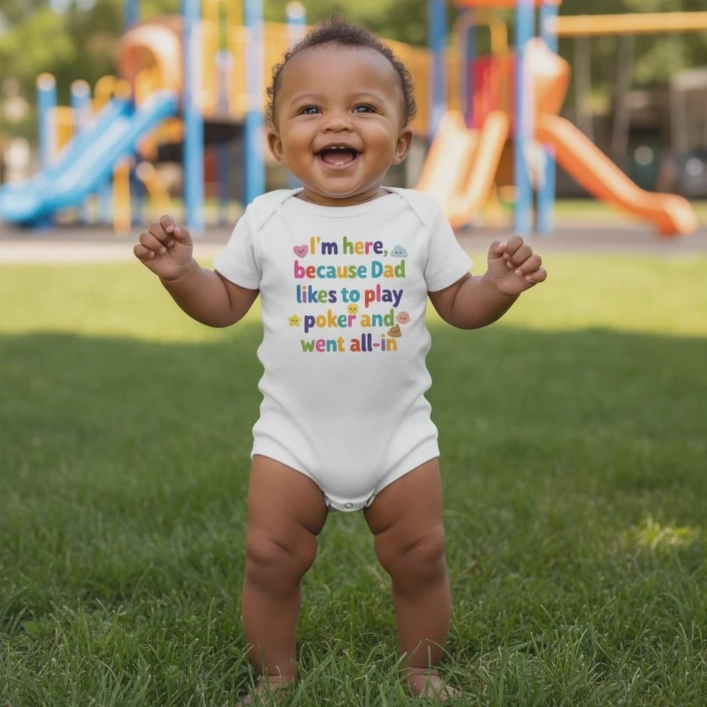 Bringen Sie Spaß in die Garderobe Ihres Babys mit unserem einzigartigen Baby-Body, der eine humorvolle Botschaft vermittelt. Auf diesem Strampler steht 'I'm here because Dad likes to play poker and went all-in', was ihn zu einem perfekten Geschenk für pokerbegeisterte Eltern macht.
